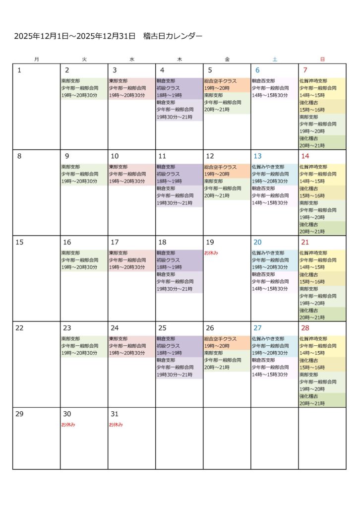 | 佐賀神埼支部 | 少年部一般部合同 14:00~15:00 ※強化稽古 15:00〜16:00 | |||||
